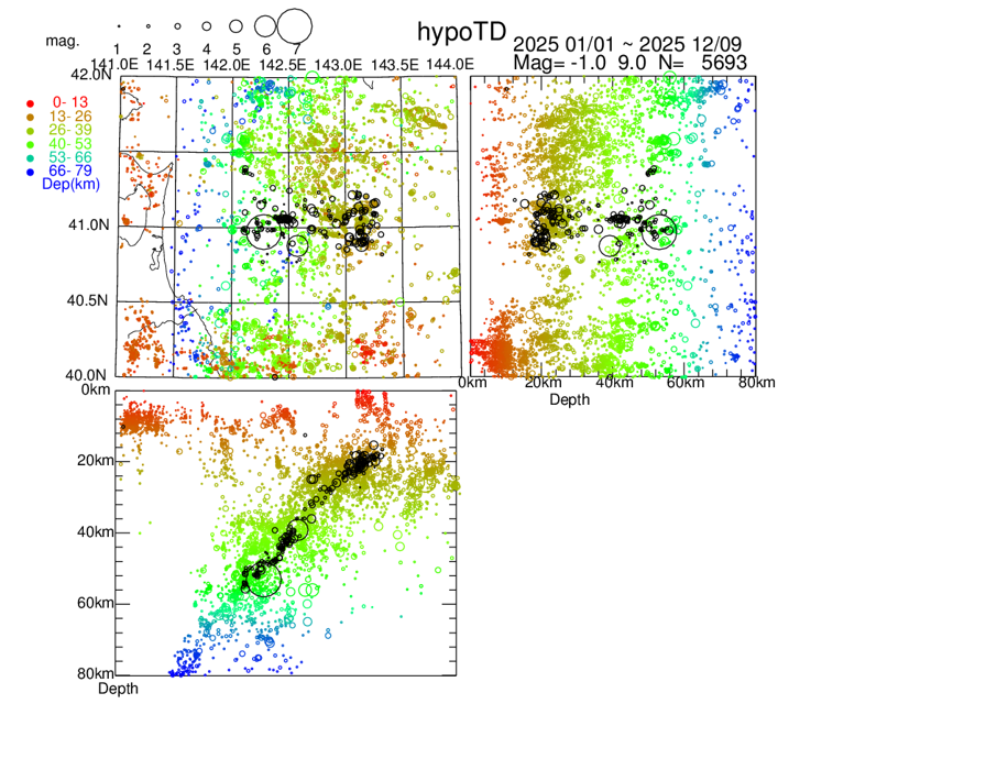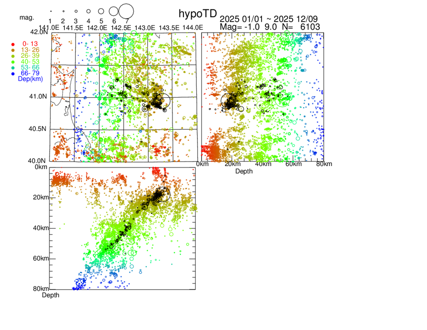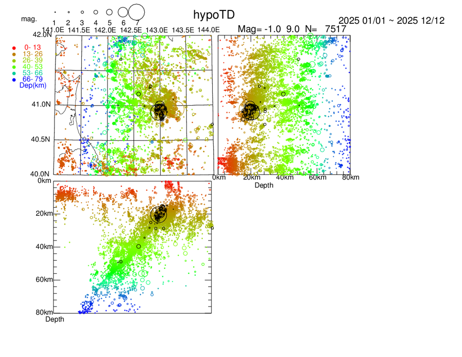 青森県東方沖で2025年1月1日ー2025年12月13日発生した地震のhypoTDを用いた震源再決定結果。