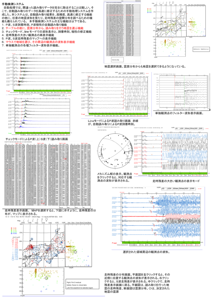 以下は、P波、S波到着時刻を手動で、高速、かつ、高精度に読み取るためのソフト(堀内・他、惑星関連合同大会、2017)の概要である。
