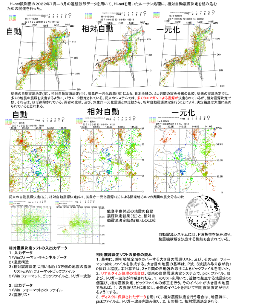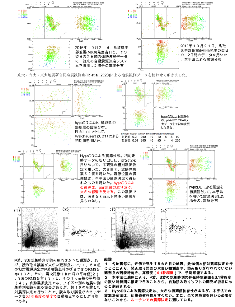 | 相対震源決定による、読み取りデータの自動修正機能を備えた自動震源決定システム この自動震源決定システムは、弊社ホームサイスモメータと飯尾能久先生(京都大学防災研究所)、加藤愛太郎先生(東大地震研)、岡田知己先生(東北大学大学院理学研究科)との共同研究によるものである。 以下は日本地震学会2022年度秋季大会発表内容からの引用。 1. はじめに 株式会社 ホームサイスモメータは(堀内他、2009)、到着時刻の自動読み取り、震源決定システムの開発を行っており、精度の高い自動震源決定システムを構築している。しかし、各種ノイズの混入のため、全ての観測点の読み取りを正確に行うことは難しく、間違った震源を決定する場合もある。 自動震源決定では、走時残差を利用して、間違った読み取りデータの削除が行われているが、地下構造に大きな不均質性が存在するため、読み取り誤差と、不均質性による走時残差とを区別することが難しい。一方、隣接して発生する2個の地震を相対震源決定すると、不均質性の影響が相殺され、走時残差は小さくなる。従って、相対震源決定の走時残差を用いれば、自動読み取りの誤差が大きい観測点を自動検出できる可能性がある。我々は、一個の地震について、その近傍で発生するマグニチュードの大きい地震を数10個選び、一個の地震と、数10個の地震との相対震源決定を行うことにより、その地震の各観測点での読み取り誤差を検出し、自動修正を行うシステムを開発した。また、自動震源決定に適した相対震源決定手法を開発した。以下にその方法と、結果について、述べる。 2.複数の地震の相対震源決定を用いた読み取り誤差の推定方法 隣接して発生する地震を、相対震源決定すると、パスの違いによる不均質性の影響が相殺され、走時残差を小さくすることができる。また、大きい地震のS/N比は、小さい地震のそれに比べ高く、読み取り精度は高い傾向にある。以下に、自動震源決定された地震Akについて、その近傍に震源決定された複数の地震の到着時刻データを用いて、地震Akの間違った読み取りデータの検出、および、読み取りが行われなかった観測点の再読取り方法について述べる。 先ず、地震Akの近傍に震源決定され、かつ、マグニチュードの大きい地震をN個(Bkm)選び、Akとの相対震源決定を行う。一般に、震源距離の近い観測点のS/Nは高く、読み取り精度が高いことから、相対震源決定では、近い観測点の重みを大きくした。また、自動震源決定では、間違った読み取りデータが混入する場合があることから、相対震源決定の残差が、残差の2乗平方誤差の2倍以上のデータを削除し、再決定するようにした。削除後の、P波、S波合わせた読み取り点数が5点以下、あるいは、走時残差が閾値を超える場合には、相対震源決定を行わないようにした。 地震Akのj観測点の読み取り値をAkj、地震Bkmとの相対震源決定の、j観測点の走時残差をRkmjとする。N個の全ての地震について、j観測点の到着時刻が読み取られていると、j観測点についての走時残差はN個になる。次に、複数の走時残差の分布の特徴から、Ak地震のj観測点の読み取り値Akjが正しいかを判定するようにした。 Akjの読み取り誤差が大きい場合は、走時残差、Rkmj の平均値が、0から、誤差分だけずれる。そこで、Rkmjの平均値(Rkm)と、2乗平均誤差(σkj)を求め、Rkm の絶対値がσkjの2倍以上であれば、Akjが間違っていると判定するようにした。 地震Bkmのj観測点の読み取りに誤差がある場合は、その地震に対応する誤差が大きくなり、それが原因で、平均値や、2乗平均誤差を間違える可能性がある。そこで、Rkmj が、σkjの2倍以上であれば、そのデータは削除し、RkmとRkmj、および、σkj を再計算するようにした。Akjと、走時残差の平均値Rkmとの差は、Akjの理論値(Tkj)であり、2乗平均誤差は、その推定誤差を表す。 Ak地震のj観測点の読み取り値Akjが存在しない場合で、地震Bkmのj観測点の読み取り(Bkmj)が存在する場合は、相対震源決定を行うことにより、地震Bkmの地震毎に、j観測点の到着時刻の理論値を求めることができる。Akjの到着時刻が存在する場合と同様に、個々に求められる理論値から、到着時刻の理論値Tkjと、その2乗平均誤差を求めた。 上述の方法で、Akjの理論値及び、その2乗平均誤差(σkj)を求め、間違っていると判断された読み取り値、あるい、読み取りが行われていない観測点の場合は、Akjが存在する時間範囲が、(理論走時―2σkj)~(理論走時+2σkj)の時間区間であるとして、その区間内に、顕著な位相が存在すれば、自動読み取りを行うようにした。 3.相対震源決定 Waldhauser & Ellsworth (2000)によるHypoDDは、解析する全領域で発生する全地震の相対震源決定の誤差が最小となるように震源決定する方法である。自動震源決定は、日本列島全域で発生する地震を対象にして行う場合もある。また、地震は、毎日発生することから、地震が発生する度に、過去に遡って、HypoDDを行うと、計算機の負荷は膨大にな
